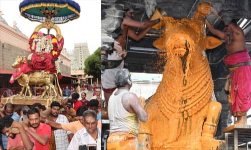 திருவண்ணாமலை அருணாசலேஸ்வரர் கோவிலில், ஆடி மாத தேய்பிறை பிரதோஷத்தை முன்னிட்டு, ராஜகோபுரம் அருகே உள்ள பெரிய நந்திய பகவானுக்கு பால், சந்தன உள்ளிட்டு பொருள்களால் சிறப்பு அபிஷேகம், வழிபாடு நடந்தது. விழாவில் சிறப்பு அலங்காரத்தில் தங்க ரிஷப வாகனத்தில் உண்ணாமுலையம்மன் சமேதராய் அண்ணாமலையார் மூன்றாம் பிரகாரத்தில் வலம் வந்து பக்தர்களுக்கு அருள்பாலித்தனர். ஏராளமான பக்தர்கள் கலந்து கொண்டு வழிபாடு செய்தனர்.