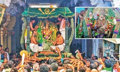 திருச்செந்தூர் சுப்பிரமணியசுவாமி கோயிலில் பச்சைசாத்தி கோலத்தில் சண்முகர் வீதி உலா