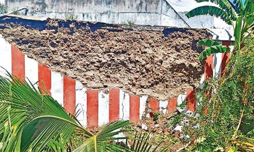 பெருமாள் கோயில் சுற்றுச்சுவர் மழைக்கு சரிந்து விழுந்தது