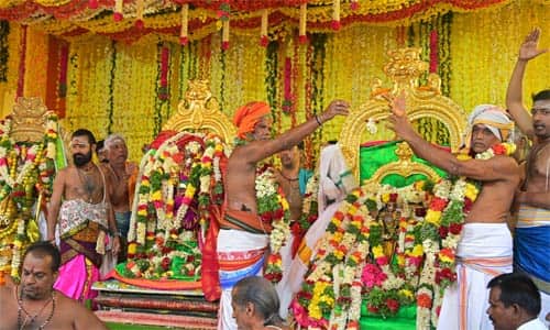 திருப்புவனம்; திருப்புவனம் புஷ்பவனேஷ்வரர் - சவுந்தரநாயகி அம்மன் கோயில் பங்குனி திருவிழாவின் முக்கிய நிகழ்ச்சியான திருக்கல்யாண வைபவ உற்சவம் நேற்று நடந்தது. திருப்புவனம் புஷ்பவனேஷ்வரர் சவுந்தர நாயகி அம்மன் கோயில் பங்குனி திருவிழா கடந்த 15ம் தேதி கொடியேற்றத்துடன் தொடங்கியது. பத்து நாட்கள் நடைபெறும் இந்த பத்து நாள் திருவிழாவில் தினசரி அம்மனும், சுவாமியும் பல்வேறு வாகனங்களில் வீதியுலா வந்து பக்தர்களுக்கு காட்சியளிப்பது வழக்கம். விழாவின் முக்கிய நிகழ்ச்சியான திருக்கல்யாண உற்சவம் இன்று நடந்தது. அலங்கரிக்கப்பட்ட திருக்கல்யாண மண்டபத்தில் புஷ்பவனேஷ்வரர் சவுந்தரநாயகி அம்மன், பிரியாவிடை தாயாருடன் எழுந்தருளினார். திருக்கல்யாணத்தை முன்னிட்டு அம்மனுக்கும் சுவாமிக்கும் சிறப்பு பூஜைகள் நடந்தன. அம்மன் சார்பாக சேகர் பட்டரும், சுவாமி சார்பாக ஈஸ்வர பட்டரும் மாலை மாற்றி கொண்டனர். காலை 9:45 மணிக்கு பாபு பட்டர் திருக்கல்யாண வைபவத்தை நடத்தி வைத்தார். திருக்கல்யாண உற்சவம் முடிவடைந்த பின் தீபாராதனை காட்டப்பட்டு பிரசாதங்கள் வழங்கப்பட்டன. திருமணமான பெண்கள் திருக்கல்யாணத்தை முன்னிட்டு புதிய திருமாங்கல்ய கயிறு மாற்றி கொண்டனர். திருக்கல்யாண வைபவத்தை முன்னிட்டு பக்தர்களுக்கு அன்னதானம் வழங்கப்பட்டன. மானாமதுரை டி.எஸ்.பி. கண்ணன், இன்ஸ்பெக்டர் சிவகுமார் தலைமையில் பாதுகாப்பு பணியில் போலீசார் ஈடுபட்டனர். கடந்தாண்டு திருக்கல்யாண உற்சவத்தில் பெண்கள் தங்க நகைகளை பறிகொடுத்ததையடுத்து இந்தாண்டு கூடுதல் பெண் போலீசார் சாதாரண உடையில் பாதுகாப்பு பணியில் ஈடுபட்டனர். போலீசார் அடிக்கடி ஒலிபெருக்கி மூலம் பொதுமக்களை எச்சரித்த வண்ணம்இருந்தனர். விழாவின் முக்கிய நிகழ்வான தேரோட்டம் நாளை காலை எட்டு மணிக்கு நடைபெற உள்ளது. விழாவிற்கான ஏற்பாடுகளை தேவஸ்தான மேலாளர் இளங்கோ, கண்காணிப்பாளர் வேலுச்சாமி மற்றும் பக்தர்கள் செய்திருந்தனர்.