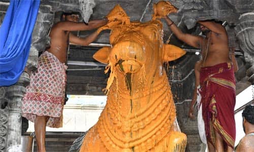 திருவண்ணாமலை; அருணாசலேஸ்வரர் கோவிலில், சித்திரை மாத மஹாப்பிரதோஷத்தை முன்னிட்டு, ராஜகோபுரம் அருகே உள்ள பெரிய நந்திய பகவானுக்கு பால் அபிஷேகம் நடந்தது.