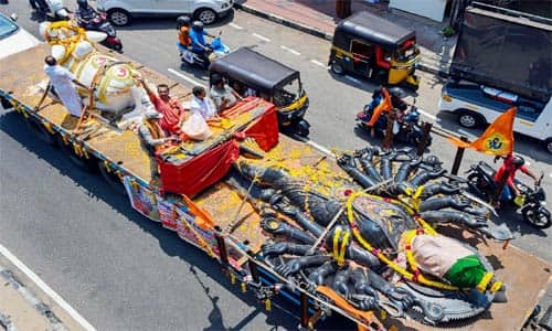 பளிங்கு கற்களுக்கு பெயர் பெற்ற, ராஜஸ்தானின் ஜெய்ப்பூரில், நாட்டின் பல்வேறு பகுதிகளில் உள்ள கோவில்களுக்கு சாமி சிலைகள் செய்து அனுப்பி வைக்கப்பட்டு வருகின்றன. அந்த வகையில், இங்குள்ள முகேஷ் பரத்வாஜ் என்ற சிற்பி, 18.5 அடி உயர காளி சிலையை பிரமாண்டமாக வடிவமைத்துள்ளார். ஒரே பளிங்கு கல்லில் உருவாக்கப்பட்ட இந்த சிலை, கேரளாவின் திருவனந்தபுரத்தில் உள்ள பவுர்ணமிகாவு கோவிலுக்காக தயார் செய்யப்பட்டுள்ளது. 50 டன் எடையில் உருவாக்கப்பட்ட இந்த காளி சிலையுடன், 12 அடி உயர துர்கா மற்றும் ராஜ மாதங்கி தேவி சிலைகளும் உருவாக்கப்பட்டு உள்ளன. இந்த சிலைகளுடன் அவற்றிற்கான வாகனங்களான அன்னப்பறவை, சிங்கம், புலி, மயில் ஆகியவையும் தயார் செய்யப்பட்டுள்ளன. சிலைகள் முழுமை பெற்றதை அடுத்து, அதற்கான பூஜைகள் செய்யப்பட்டு திருவனந்தபுரத்துக்கு லாரியில் எடுத்து வரப்பட்டது. திருவனந்தபுரம் பவுர்ணமிகாவு கோவிலில் சிலைகளை பிரதிஷ்டை செய்வதற்கான ஏற்பாடுகள் முழுவீச்சில் நடந்து வருகின்றன.