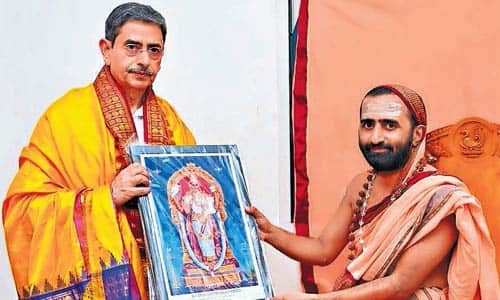 கர்நாடகா மாநிலம், சிமோகா மாவட்டம், கூடலி மகா சம்ஸ்தானம், தக்சிணாம்நாய ஸ்ரீ சாரதா பீடத்தின், 72வது பீடாதிபதி, அபிநவ சங்கர பாரதி மஹா சுவாமிகள். இவரின் விஜய யாத்திரை, கடந்த 4ம் தேதி துவங்கியது. இதை முன்னிட்டு அன்று மாலை, பட்டன பிரவேஷம் மற்றும் ஷோபா யாத்திரை சென்னை, மேற்கு மாம்பலம், கோல்கட்டா காளி கோவிலில் இருந்து, அயோத்தியா மண்டபம் வரை நடந்தது. இதையடுத்து, அயோத்தியா மண்டபத்தில் மஹா சுவாமிகளின் அருளாசியும், சகஸ்ர சண்டி மஹா யக்ஞனமும் நடந்தது. அதன் பின், அபிநவ சங்கர பாரதி மஹா சுவாமிகள், பெசன்ட்நகரில் தங்கி பூஜைகள் நடத்தி அருளாசி வழங்கினார். மேலும், பக்தர்கள் வேண்டுகோளுக்கு இணங்க, கிரஹ பிரவேசம் செய்து அருளாசியும் வழங்கினார். இந்நிலையில் நேற்று மாலை, தமிழக கவர்னர் ரவி, அபிநவ சங்கர பாரதி மஹா சுவாமியை சந்தித்து ஆசி பெற்றார். பின், சிறிது நேரம் உரையாடிவிட்டு புறப்பட்டார்.