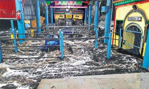 உள்ள , அமணலிங்கேஸ்வரர் கோவிலை மழை வெள்ளம் சூழ்ந்தது. கோவில் வளாகத்தில் உள்ள மூலவர் சன்னதி, சுப்ரமணியர் சன்னதியில் மழை வெள்ளம் கரைபுரண்டு சென்றது. அதேபோன்று, மலை மீது உள்ள பஞ்சலிங்கம் அருவி, காட்டாற்றிலும் வெள்ளப்பெருக்கு ஏற்பட்டது. அப்பகுதியில் இருந்த மலைவாழ் மக்கள், கோவில் பணியாளர்கள் பாதுகாப்பான பகுதியில் மண்டபத்தில் தங்கினர்.