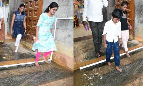 திருப்பூர்: திருப்பூர் ஸ்ரீவிஸ்வேஸ்வர சுவாமி கோவிலில், ராஜகோபுரம் நிலைப்படிக்கு வெளியே, சிறிய வரப்பு போன்று அமைத்து, அதற்குள், தண்ணீர் ஒரு இன்ச் அளவுக்கு தேங்கி நின்று, செல்வது போல் அமைக்கப்பட்டுள்ளது. தண்ணீர் குழாய் அமைத்து, நுண்ணீர் பாசனம் போல் தண்ணீர் விழும் வகையில் செய்துள்ளனர். இதன் மூலம் கோவிலுக்கு வரும் பக்தர்கள், தங்கள் பாதங்களை தண்ணீரில் நனைத்து செல்லும் வசதி செய்யப்பட்டுள்ளது. கோவில் அலுவலர்கள் கூறுகையில், ‘அறங்காவலர் குழு ஏற்பாட்டில், இத்தகைய வசதி செய்துள்ளோம். பக்தர்கள் வெளியே இருந்து வரும் போது, பாதங்களை தண்ணீரில் நனைத்து உள்ளே வரும்வகையில் அமைக்கப்பட்டுள்ளது. அதிக அளவு பக்தர் வரும் கோவில்களில், நோய் தொற்று பரவலை தடுக்க இத்தகைய வசதி செய்வது வழக்கம். இதேபோல், வீரராகவப்பெருமாள் கோவிலிலும் அமைக்கப்பட உள்ளது,’ என்றனர்.