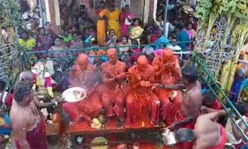 புதுச்சேரி அடுத்த ஆலங்குப்பம் கிராமத்தில் அமைந்துள்ள அங்காளபரமேஸ்வரி அம்மன் கோவில் மயானக்கொள்ளை விழாவை முன்னிட்டு கடந்த 23ம் தேதி கொடி ஏற்றத்துடன் துவங்கியது. விழாவையொட்டி தேர்வு செய்யப்பட்ட பக்தர்களுக்கு 50 கிலோ மிளகாய் பொடி அபிஷேகம் மற்றும் சந்தனம் பால் தயிர், எலும்பிசை,மஞ்சள், இளநீர், உள்ளிட்ட ஆறு வகையான சிறப்பு அபிஷேகம் வெகு விமர்சையாக நடைபெற்றது. இந்த அங்காளம்மன் கோவிலில் நடைபெற்ற மிளகாய் பொடி அபிஷேகத்தில் கலந்து கொண்டால் குழந்தை பாக்கியம் கிட்டும் திருமண தோஷம் நீங்கும் அனைத்து விதமான நோய்களும் நீங்கும் என்பது ஐதீகம். விழாவில் பல்வேறு பகுதிகளில் இருந்து பக்தர்கள் கலந்து கொண்டு தங்களுடைய வேண்டுதலை நிறைவேற்றினர். விழாவிற்கான ஏற்பாடுகளை பஞ்சாயத்தார்கள் மற்றும் ஊர் பொது மக்கள் செய்துள்ளனர்.