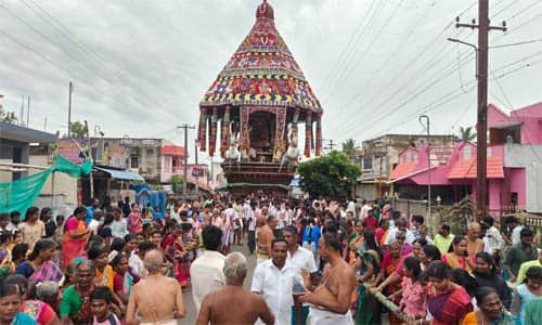 மயிலாடுதுறை மாவட்டம் குத்தாலம் தாலுக்கா தேரழந்தூரில் செங்கமல வல்லி தாயார் சமேத ஆமருவியப்பன் கோவில் உள்ளது. 108 வைணவ திருத்தலங்களில் ஒன்றானதும், திருமங்கை ஆழ்வாரால் 45 பாசுரங்கள் பாடி மங்களாசாசனம் செய்யப்பட்டதுமான இந்தக் கோவிலின் வைகாசி பெருவிழா கடந்த 10ம் தேதி பூர்வாங்க பூஜைகள், 11ம் தேதி கொடியேற்றத்துடன் தொடங்கி, 25ம் தேதி வரை 16 நாட்கள் நடைபெறுகிறது. விழாவில் 9ஆம் நாள் திருவிழாவான தேரோட்டம் இன்று காலை ரிஷப லக்கனம், திருவோண நட்சத்திரத்தில் நடைபெற்றது தேரோட்டத்தை முன்னிட்டு சிறப்பு திருமஞ்சனத்திற்கு பிறகு தாயார் சமேயதராய் ஆமருவியப்பன் பெருமாளுக்கு சிறப்பு அலங்காரத்தில் தேரில் எழுந்தருளினார். அப்போது பட்டாச்சாரியார்கள் மகா தீபாராதனை காண்பித்த பின்னர் திரளான பக்தர்கள் பக்தி பெருகுடன் கோவிந்தா கோவிந்தா என கோஷமிட்ட வாரு தேரின் வடம் பிடித்து இழுத்தனர். தேர் கோவிலில் நான்கு வீதிகளையும் வலம் வந்த போது அப்பகுதி மக்கள் பெருமாளுக்கு அர்ச்சனைகள் செய்து வழிபாடு நடத்தினர். தேரோட்டத்திற்கான ஏற்பாடுகளை கோவில் செயல் அலுவலர் சுந்தர்ராஜன் தலைமையிலானோர் செய்திருந்தனர்.