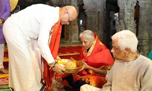 திருப்பதி ஏழுமலையான் கோவிலில் சாமி தரிசனம் செய்வதற்காக மத்திய நிதியமைச்சர் நிர்மலா சீதாராமன் தனது குடும்பத்துடன் நேற்று மாலை திருமலைக்கு வந்தார். அங்குள்ள காயத்ரி தங்கும் விடுதிக்கு வந்த மத்திய அமைச்சருக்கு தேவஸ்தான கூடுதல் அதிகாரி வெங்கையா சவுத்ரி பூங்கொத்து கொடுத்து வரவேற்றார். அதைத்தொடர்ந்து விடுதியில் தங்கி இரவு ஓய்வெடுத்த நிதியமைச்சர் நிர்மலா சீதாராமன், இன்று (வெள்ளிக்கிழமை) காலை திருப்பதி ஏழுமலையான் கோவிலில் சாமி தரிசனம் செய்தார். அவருக்கு கோவில் நிர்வாகம் சார்பில் சிறப்பு மரியாதை, பிரசாதம் வழங்கப்பட்டது.