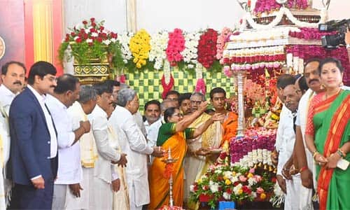 மைசூரு; சாமுண்டீஸ்வரி அம்மன் சிலைக்கு மலர் துாவி பூஜை செய்து மைசூரில் 415 வது ஆண்டு தசராவை, எழுத்தாளர் பானு முஷ்டாக் துவக்கி வைத்தார். இன்று முதல் 11 நாட்களும் தசரா கொண்டாடப்படுகிறது. இதையொட்டி நகரமே விழா கோலம் பூண்டது . உலகப்புகழ் பெற்ற மைசூரு தசரா, மன்னர் காலத்தில் இருந்தே கொண்டாடப்படுகிறது. கடந்த 1610ம் ஆண்டு முதல் முறை கொண்டாடப்பட்டது. போரில் வெற்றி பெறுவதை கொண்டாடும் வகையில், விஜயதசமி என்ற பெயரில் தசரா கொண்டாடினர். யானைகள், குதிரை படைகளுக்கு சிறப்பு பூஜை செய்யப்படும். அப்போது இருந்து ஒவ்வொரு ஆண்டும் பாரம்பரியம், கலாசாரம் மாறாமல் இந்த விழா நடக்கிறது. இந்த ஆண்டிற்கான தசரா இன்று துவங்கி அடுத்த மாதம் 2ம் தேதி வரை 11 நாட்கள் நடக்க உள்ளது. இதுவரை 414 ஆண்டுகள் தசரா கொண்டாடப்பட்ட நிலையில், இன்று துவங்குவது 415 ஆண்டு தசரா. விருச்சிக லக்கனம் சாமுண்டி மலையில் உள்ள சாமுண்டீஸ்வரி அம்மனுக்கு, மலர் துாவி பூஜை செய்வதன் மூலம், ஒவ்வொரு ஆண்டும் தசரா துவங்குகிறது. ஏதாவது ஒரு துறையில் சாதித்தவர்கள் துவக்கி வைக்கின்றனர். இந்த ஆண்டு தசராவை புக்கர் விருது பெற்ற, எழுத்தாளர் பானு முஷ்டாக் துவக்கி வைத்தார். இன்று காலை, 10:10 மணியில் இருந்து 10:46 மணிக்குள், விருச்சிக லக்கனத்தில், வெள்ளி தேரில் வீற்றிருக்கும் சாமுண்டீஸ்வரி அம்மன் சிலைக்கு, பானு முஷ்டாக் மலர் துாவி, தசராவை துவக்கி வைத்தார். முதல்வர் சித்தராமையா, துணை முதல்வர் சிவகுமார், அமைச்சர் மஹாதேவப்பா, அதிகாரிகள் பங்கேற்றனர். பாரம்பரிய வரலாறு கொண்ட தசராவை ஒட்டி, மைசூரு நகரமே விழா கோலம் பூண்டு உள்ளது. மைசூரு சில்க் சாரி பெண்களுக்கு புடவை என்றால் அலாதி பிரியம். அதிலும் மைசூரு சில்க் சாரி என்றால் சொல்லவா வேண்டும். பெண்களை கவர்ந்து இழுக்கும் வகையில், மைசூரு நகரில் உள்ள ஜவுளி கடைகளில், பல டிசைன்களில் மைசூரு சில்க் சாரி விற்பனைக்கு வந்து உள்ளன. இதுபோல ஹேண்ட் பேக், ஹீல்ஸ் என பெண்களுக்கான பொருட்கள் விற்பனைக்காக குவிந்து உள்ளன. மைசூரு பாகு மைசூரு இனிப்பு என்றாலே முதலில் நினைவுக்கு வருவது மைசூரு பாகு தான். சாதாரண நாட்களில் மைசூரு வருவோரே அதிகமாக, மைசூரு பாகு வாங்கி செல்வர். இப்போது பண்டிகை காலம் வேறு, கேட்கவா வேண்டும். மைசூரு பாக் விற்பனை அமோகமாக இருக்கும் என்பதால், ஸ்வீட்ஸ் கடைகளில் வழக்கத்தை விட கூடுதலாக, மைசூரு பாக் தயாரிக்க உள்ளனர். பண்டிகையை ஒட்டி ஆர்டர்களும் குவிந்து வருகின்றன. இதுபோல மைசூரு சாண்டல் சோப், மைசூரு சைக்கிள் அகர்பத்தியும், மைசூரில் தயாரிக்கப்படுகிறது. தசராவுக்கு வருவோர் வாங்கி செல்வர் என்பதால், கணிசமான லாபம் கிடைக்கும். உணவு மேளா தசரா முடிந்த பின், மூன்று நாட்கள் உ