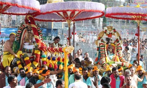 திருமலை ஏழுமலையான் வருடாந்திர பிரம்மோற்சவம், விமரிசையாக நடைபெற்று வருகிறது. பிரம்மோற்சவ விழாவின், நான்காம் ஐந்தாம் நாளான நேற்று காலை, ஸ்ரீவில்லிபுத்தூர் ஆண்டாள் மாலை அணிந்து, தோளில் கிளி சுமந்து மோகினி அலங்காரத்தில் பல்லக்கில் பவனி வந்து பக்தர்களுக்கு அருள்பாலித்தார். ஏராளமான பக்தர்கள் தரிசனம் செய்தனர். விழாவில் பல்வேறு மாநிலங்களைச் சேர்ந்த கலைஞர்களின் நடனம் பக்தர்களை வெகுவாகக் கவர்ந்தன. விழாவில் ஏராளமான பக்தர்கள் பரவசத்துடன் தரிசனம் செய்தனர்.