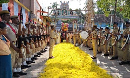 சுசீந்திரம்: திருவனந்தபுரம் பத்மநாப சுவாமி கோவிலில் நடைபெற்ற நவராத்திரி விழாவிற்கு சென்றிருந்த சுசீந்திரம் முன்னுதித்த நங்கை அம்மன் நவராத்திரி விழா முடிந்து கோவிலுக்கு திரும்பும் போது போலீஸ் அணிவகுப்பு மரியாதை செய்தனர்.