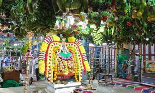 திருவேற்காடு, சன்னிதி தெருவில் தேவி கருமாரியம்மன் கோவில் உள்ளது. இங்கு, ஒவ்வொரு ஆண்டும் புரட்டாசி மாதம் பவுர்ணமி தினத்தை ஒட்டி மூன்று நாட்கள் நிறைமணி காட்சி விழா நடக்கிறது. ‘மழை பெய்து உலகம் செழிக்க வேண்டும், விவசாயம் தழைக்க வேண்டும் ஜீவராசிகள் பசி, பட்டினி, பஞ்சம் இல்லாமல் வாழ வேண்டும்’ என்பன உள்ளிட்ட மக்களின் வேண்டுதல்கள் நிறைவேறும் வகையில், நிறைமணி விழா நடத்தப்படுகிறது. அந்த வகையில், இந்தாண்டிற்கான விழா நேற்று துவங்கியது. இதற்காக, கோவில் கருவறை, முன் மண்டபம் பகுதியில் வாழைப்பழம், அன்னாசி பழம், மாதுளம் பழம், ஆப்பிள் போன்ற பல்வேறு வகையான பழங்கள், காய்கறிகள், தானியங்கள், எண்ணெய், மூலிகை தாவரங்கள், இனிப்பு வகைகள் உள்ளிட்ட 5,000 கிலோ பொருட்களை, பந்தல் போல் கட்டி தொங்க விடப்பட்டிருந்தது. இந்த நிகழ்வு பக்தர்களை பரவசத்தில் ஆழ்த்தியது.