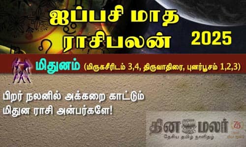 திருவாதிரை: வாழ்க்கையில் முன்னேற்றம் அடையும் யோகம் கொண்ட உங்களுக்கு, ஐப்பசி அதிர்ஷ்டமான மாதமாகும். ராகு பாக்ய ஸ்தானத்தில் சஞ்சரிப்பதால் செல்வாக்கு உயரும். நினைத்த வேலைகள் நடந்தேறும். நீண்ட நாள் கனவு நனவாகும். கடந்த மாதத்தில் ஏற்பட்ட நெருக்கடி விலகும். வியாபாரத்தில் தடை, நெருக்கடி என்றிருந்த நிலை மாறும். கணவன், மனைவிக்குள் ஏற்பட்ட சச்சரவு விலகும். தன புத்திர காரகன் குரு சஞ்சாரம் சாதகமாக இருப்பதால் குடும்பத்தில் நிம்மதி ஏற்படும். வரவேண்டிய பணம் வரும் அரசியல்வாதிகளுக்கு எதிர்பார்த்த பதவி, பொறுப்பு கிடைக்கும். எதிர்பார்த்த முன்னேற்றம் ஏற்படும். திடீர் அதிர்ஷ்ட வாய்ப்பு உண்டாகும். பணியாளர்களுக்கு எதிர்பார்த்த இடமாற்றம், பதவி உயர்வு கிடைக்கும். புதியதாக தொழில் தொடங்க நினைத்தவர்களின் எண்ணம் நிறைவேறும். அசையா சொத்துகள் வாங்கும் முயற்சி வெற்றியாகும். வேலை தேடுவோருக்கு தகுதியான வேலை கிடைக்கும். வம்பு வழக்குகள் என்றிருந்த நிலை மாறும். உடல் நிலையில் ஏற்பட்ட பாதிப்பு விலகும். போட்டியாளர்கள் உங்களிடம் வந்து சரணடையும் நிலை ஏற்படும். உங்கள் லாபாதிபதி அக். 27 முதல் குருபார்வையுடன் சஞ்சரிப்பதால் குரு மங்கள யோகம் ஏற்பட்டு முயற்சிகள் எல்லாம் வெற்றியாகும். வியாபாரிகளுக்கு புதிய ஒப்பந்தம் கிடைக்கும். செல்வாக்கும் அந்தஸ்தும் உயரும். இழுபறியாக இருந்த வேலைகள் நடந்தேறும். குடும்பத்தில் சுபநிகழ்ச்சிகள் நடந்தேறும். வெளிநாட்டு முயற்சிகள் சாதகமாகும்.