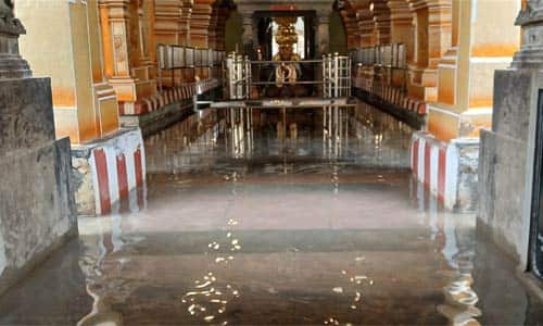 ராமநாதபுரம்: ராமநாதபுரம் மாவட்டத்தில் நேற்று இரவு முதல் விடிய விடிய பெய்த கன மழையால் உத்தரகோசமங்கை மங்களநாதர் சிவன் கோயிலுக்குள் தண்ணீர் புகுந்தது. உத்தரகோசமங்கை மங்களநாதர் சமேத மங்களேஸ்வரி கோயிலில் அபூர்வ பச்சை மரகத நடராஜர் சன்னதி உள்ளது. இங்கு ஆண்டு தோறும் ஆருத்ரா தரிசன விழா விமரிசையாக கொண்டாடப்படுகிறது. பல ஆயிரம் ஆண்டுகள் பழமை வாய்ந்த இக்கோயிலுக்கு தமிழகம் மட்டுமின்றி வெளி மாநில பக்தர்களும் வந்து செல்கின்றனர். இக்கோயிலில் ஏப்.4ல் கும்பாபிஷேகம் நடந்தது. இந்நிலையில் இன்று காலை முதல் மதியம் வரை தொடர்ந்து மழை பெய்தால் ரோட்டில் இருந்து தண்ணீர் கோயிலுக்குள் புகுந்தது. வடிகால் வசதி இல்லாததால் தண்ணீர் வெளியேற முடியாமல் தேங்கியது.
