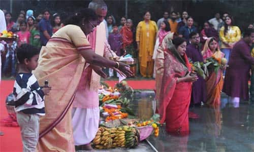 புதுடில்லி; சாத் பூஜை என்பது சூரியக் கடவுளுக்கு நன்றி சொல்ல நடத்தப்படும் விழாவாகும். வடமாநிலங்களில் சிறப்பாக கொண்டாடப்படுகிறது. விழாவானது நான்கு நாட்களுக்கு நடைபெறும். நான்காவது நாளில் நீர் நிலைகளில் கூடி மக்கள் பூஜை செய்து சூரிய பகவானை வழிபடுவர். இன்று சாத் பூஜையை முன்னிட்டு, ஜனாதிபதி திரௌபதி முர்மு சாத் பூஜை கொண்டாட்டங்களில் பங்கேற்றார், சூரியனுக்கு அர்க்யம் செலுத்தி வழிபட்டார். சக குடிமக்களின் நல்வாழ்வு மற்றும் செழிப்புக்காக ஜனாதிபதி பிரார்த்தனை செய்தார்.