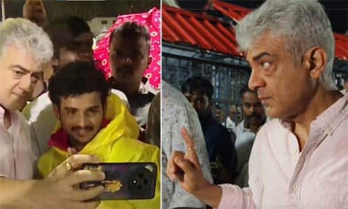 தமிழ் சினிமாவின் முன்னனி நடிகர்களில் ஒருவர் நடிகர் அஜித்குமார். நடிகர் அஜித்குமார் பல்வேறு கோவில்களில் தரிசனம் செய்து வருகிறார். அவர் இன்று காலை திருப்பதி ஏழுமையலையான் கோவிலில் அதிகாலை சுவாமி தரிசனம் செய்தார். அவருக்கு கோவில் நிர்வாகம் சார்பில் பிரசாதம் வழங்கப்பட்டது. முன்னதாக , கோவில் வளாகத்தில் நடந்து வந்த அஜித்குமாரை பார்த்த ரசிகர்கள் தல தல. என கோஷம் எழுப்பினர். இதை கண்டித்த அஜித் ’இது கோவில்’ என கூறிய செய்கை செய்தார். பின்னர் தரிசனம் முடித்து வெளியே வந்த அஜித் காது கேட்காத ஒரு ரசிகருடன் செல்பி எடுத்து சென்றார்.