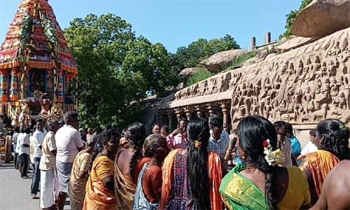 மாமல்லபுரத்தில் உள்ள, பிரசித்தி பெற்ற ஸ்தலசயன பெருமாள் கோவில், வைணவ 108 திவ்ய தேசங்களில், 63வது தேசமாக விளங்குகிறது. இதே ஊரில் அவதரித்த பூதத்தாழ்வார், இக்கோவிலில் தனி சன்னிதியில் வீற்றுள்ளார். இங்கு ஆண்டுதோறும், பூதத்தாழ்வாருக்கு கொண்டாடப்படும் அவரது ஜெயந்தி உத்சவம், கடந்த 22ம் தேதி துவங்கியது. தினமும் திருமஞ்சனம் கண்டு, நாலாயிர திவ்ய பிரபந்தம், திருப்பாவை, திருவாய்மொழி சாற்றுமறை சேவை ஏற்று, வீதியுலா செல்கிறார். நேற்று, திருத்தேரில் கோலாகல உலா சென்றார். காலை 4:30 மணிக்கு கோவில் நடை திறந்து, வழக்கமான பூஜைக்குப் பின், ரத பிரதிஷ்டை ஹோமம் நடத்தி, 5:45 மணிக்கு பூதத்தாழ்வார் திருத்தேரில் எழுந்தருளி வழிபாடு கண்டார். காலை 8:15 மணிக்கு, பக்தர்கள் தேரின் வடம் பிடித்து இழுத்தனர். பின், மாடவீதிகளில் பக்தர்கள் தரிசித்து வழிபட்டனர். 11:00 மணிக்கு, தேர் நிலையை அடைந்தார். ஆளவந்தார் அறக்கட்டளை சார்பில், பக்தர்களுக்கு அன்னதானம் வழங்கப்பட்டது. ஐப்பசி திருவோண நாளான நேற்று, பொய்கையாழ்வார் ஜெயந்தி நாளும் என்பதால் மாலை, ஸ்தலசயன பெருமாள், நிலமங்கை தாயார், பொய்கையாழ்வார், பூதத்தாழ்வார் ஆகியோருக்கு திருமஞ்சனம் நடை பெற்றது. ஸ்தலசயன பெருமாள் பொய்கையாழ்வாருக்கு பரிவட்ட மரியாதை அளித்தார். தொடர்ந்து, சுவாமியர் வீதியுலா சென்றனர். பூதத்தாழ்வார் ஜெயந்தி நாளான இன்று காலை 6:00 மணிக்கு, திருமஞ்சனம் கண்டு, 8:30 மணிக்கு ரத்னாங்கி சேவையாற்றி, பிற சுவாமியரின் மங்களாசாசனம் ஏற்கிறார். தொல்லியல் வளாக ஞானபிரான் சன்னிதியில், இன்று காலை 11:00 மணிக்கு மங்களாசாசனம் ஏற்று வீதியுலா செல்கிறார். மாலை 4:00 மணிக்கு, அவதார நந்தவனத்தில் எழுந்தருளி திருமஞ்சனம் கண்டு, திருப்பாவை சாற்றுமறை சேவையேற்று, இரவு 8:00 மணிக்கு, ஸ்தலசயன பெருமாளுடன் வீதியுலா செல்கிறார். நாளை, விடையாற்றி உத்சவம் நடக்கிறது.
