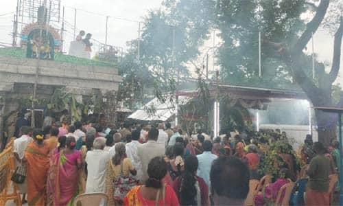திருத்தணி முருகன் கோவிலின் உபகோவிலான வடாரண்யேஸ்வரர் கோவில், திருவாலங்காடில் அமைந்து உள்ளது. இக்கோவிலுடன் இணைந்தது, பழையனுார் சாலையில் அமைந்துள்ள சாட்சிபூதேஸ்வரர் கோவில். இக்கோவிலில், 2004ல் கும்பாபிஷேகம் நடந்தது. கடந்த 2020ல் கும்பாபிஷேகம் நடைபெற இருந்த நிலையில், கொரோனா தொற்று காரணமாக கிடப்பில் போடப்பட்டது. ஆறு மாதமாக கோவில் சீரமைப்பு பணி நடந்தது. நவ., 3ம் தேதி கும்பாபிஷேகம் நடத்த தீர்மானிக்கப்பட்டு, கடந்த 31ம் தேதி மாலை 5:00 மணிக்கு பத்ரகாளியம்மனுக்கு அபிஷேகம் செய்யப்பட்டது. கடந்த 1ம் தேதி முதல் யாகசாலை பூஜையும், நேற்று முன்தினம் இரண்டாம் மற்றும் மூன்றாம் யாகசாலை பூஜையும் நடந்தது. நேற்று காலை 7:00 மணிக்கு கலச புறப்பாடு நடந்தது. பின், காலை 7:20 மணிக்கு கோபுர கலசங்களுக்கு புனிதநீர் ஊற்றப்பட்டு கும்பாபிஷேகம் நடந்தது. இதில், திருவாலங்காடு, பழையனுார் கிராமங் களில் இருந்து ஆயிரக் கணக்கான பக்தர்கள் பங்கேற்றனர்.