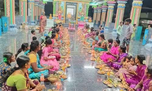கீழக்கரை: கீழக்கரை அருகே மாயாகுளம் ஊராட்சிக்கு உட்பட்ட மங்களேஸ்வரி நகரில் முத்து மாரியம்மன் கோயில் உள்ளது. ஐப்பசி பவுர்ணமியை முன்னிட்டு மூலவர் முத்துமாரியம்மன், விநாயகர், கருப்பண்ண சுவாமி, மகாலட்சுமி, துர்கை உள்ளிட்ட பரிவார தெய்வங்களுக்கு சிறப்பு அபிஷேக அலங்கார தீபாராதனைகள் நடந்தது. சுற்றுவட்டார கிராமங்களை சேர்ந்த ஏராளமான பக்தர்கள் பங்கேற்றனர். மாலையில் நுாறுக்கும் மேற்பட்ட பெண்கள் பங்கேற்ற விளக்கு பூஜை, மாங்கல்ய பூஜை உள்ளிட்டவைகள் நடந்தது. பக்தர்களுக்கு அன்னதானம் வழங்கப்பட்டது. ஏற்பாடுகளை முத்தரையர் உறவின்முறை சங்க நிர்வாகிகள் செய்திருந்தனர்.