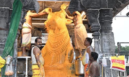 பிரதோஷ வேளையின்போது சிவன் நந்தயின் இரு கொம்புகளுக்கிடையில் நடனமாடுவதாக ஐதீகம். இதனடிப்படையில் தான் சிவாலயங்களில் நந்திக்கு பலவித அபிஷேகம் செய்யப்பட்டு சிறப்பு பூஜைகள் நடத்தப்படுகிறது. அதன்படி நினைத்தாலே முக்தி தரக்கூடிய திருவண்ணாமலையில் இன்று (17ம் தேதி) கார்த்திகை சேமவார பிரதோஷத்தை முன்னிட்டு, பிரதோஷ காலமான மாலை 4.30 மணி முதல் 6 மணி வரை அண்ணாமலையார் கோயிலில் 5ம் பிரகாரத்தில் அமைந்துள்ள பெரிய நந்திக்கு விபூதி, மஞ்சள், பால் தயிர், சந்தனம் உள்ளிட்டவைகளால் சிறப்பு அபிஷேகம், ஆராதனைகள் நடந்தது. இதில் ஏராளமான பக்தர்கள் கலந்து கொண்டு தரிசனம் செய்தனர்.