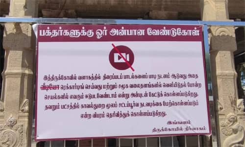 திருச்செந்துார் சுப்பிரமணிய சுவாமி கோயிலுக்கு வரும் பக்தர்கள் சிலர் கோவில் பிரகார பகுதிகளில் நின்று, சினிமா பாடலுக்கு நடனமாடி அதை வீடியோவாக எடுத்து தங்களது சமூக வலைதள பக்கங்களில் பதிவேற்றம் செய்கின்றனர். இதனால் கோயிலுக்கு வருகை தரும் பக்தர்கள் முகம் சுழிக்கும் நிலை ஏற்படுகிறது. கோயில் பிரகாரத்தில் ரீல்ஸ் வீடியோ எடுப்பதை கட்டுப்படுத்த வேண்டும் என, பல்வேறு தரப்பினரும் தொடர்ந்து கோரிக்கை விடுத்து வந்தனர். இந்நிலையில், கோவில் பிரகாரத்தில் சினிமா பாடல்களுக்கு நடனமாடும் வகையில், ரீல்ஸ் வீடியோ எடுக்க கோவில் நிர்வாகம் தடை விதித்துள்ளது. இதுதொடர்பாக கோயிலை சுற்றி, பல்வேறு இடங்களில் வைக்கப்பட்டுள்ள அறிவிப்பு பலகையில், திருக்கோவில் வளாகத்தில் திரைப்பட பாடல்களை பாடி நடனம் ஆடுவது, அதை வீடியோ ரெக்கார்டிங் செய்வது மற்றும் சமூக வலைதளங்களில் வெளியிடுதல் போன்ற செயல்களில் யாரேனும் ஈடுபட வேண்டாம் என அன்புடன் கேட்டுக் கொள்ளப்படுகிறது. தவறும் பட்சத்தில் காவல்துறை மூலம் சட்டப்பூர்வ நடவடிக்கை மேற்கொள்ளப்படும் என தெரிவிக்கப்பட்டுள்ளது. பக்தர்கள் அதிகம் கூடும் இடமான கோயில் முன்புள்ள சண்முகவிலாச மண்டபம், வசந்த மண்டபம், பக்தர்கள் தரிசனம் செய்ய காத்திருக்கும் இடம் என, பத்துக்கும் மேற்பட்ட இடங்களில் அறிவிப்பு பலகை வைக்கப்பட்டுள்ளது.