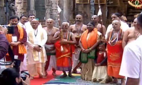 முன்னதாக ஜனாதிபதி திரௌபதி முர்மு நேற்று வியாழன் மாலை திருமலை வந்தார். திருமலையில் உள்ள ஸ்ரீ பத்மாவதி ஓய்வு இல்லத்திற்கு வந்த அவரை ஆந்திர மாநில உள்துறை அமைச்சர் வாங்கலபுடி அனிதா, தேவஸ்தான தலைவர் பி.ஆர். நாயுடு, நிர்வாகக்குழு உறுப்பினர்கள் மலர்க்கொத்து கொடுத்து வரவேற்றனர். தொடர்ந்து இன்று காலை திருமலை வெங்கடேஸ்வர சுவாமி கோவில் வந்த ஜனாதிபதி திரௌபதி முர்முக்கு கோவில் நிர்வாகம் சார்பில் சிறப்பு மரியாதை செய்யப்பட்டது. கோயில் குருக்கள் பாரம்பரியமான இஸ்திகாபல் வரவேற்பை வழங்கினார். ஆந்திராவின் அறக்கட்டளை அமைச்சர் அனம் ராம்நாராயண் ரெட்டியும் ஸ்ரீவாரி தரிசனத்திற்காக ஜனாதிபதியுடன் சென்றார். கருவறைக்குள் ஸ்ரீ வெங்கடேஸ்வர சுவாமியின் மூலவரை பிரார்த்தனை செய்த பிறகு, அவருக்கு சேஷ வஸ்திரம் வழங்கப்பட்டது, அதைத் தொடர்ந்து ரங்கநாயகுலா மண்டபத்தில் வேதசிர்வசனமும் வழங்கப்பட்டது. பின்னர், நாட்டின் முதல் குடிமகனுக்கு தீர்த்த பிரசாதங்கள், ஸ்ரீவாருவின் உருவப்படம் வழங்கப்பட்டது. நிகழ்ச்சியில் தேவஸ்தான அறக்கட்டளை குழு உறுப்பினர்கள் பனபகா லட்சுமி, ஜானகி தேவி பானுபிரகாஷ் ரெட்டி, சி வெங்கையா சவுத்ரி, CVSO ஸ்ரீ முரளிகிருஷ்ணா, மாவட்ட ஆட்சியர் வெங்கடேஸ்வர், எஸ்பி சுப்பராயுடு உள்ளிட்டோர் கலந்து கொண்டனர். வெங்கடேஸ்வர சுவாமியை தரிசனம் செய்த ஜனாதிபதி பிரகாரம் வலம் வந்து மக்கள் நலன் வேண்டி பிரார்த்தனை செய்தார்.