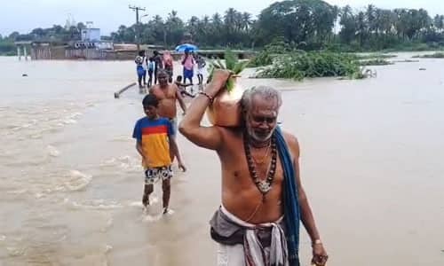 அடாத மழையிலும் விடாது நெல்லையப்பருக்கு நடக்கும் பூஜை; வெள்ள நீரில் நீந்தி சென்று தீர்த்தம் எடுத்த அர்ச்சகர்கள்