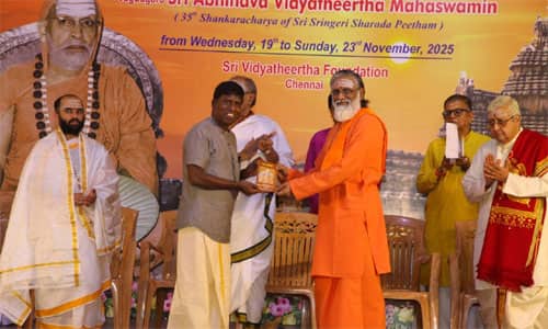 ‘சென்னை ஸ்ரீ வித்யாதீர்த்த பவுண்டேஷன்’ சார்பில் நடந்த இவ்விழாவில், மதுரை சின்மயா மிஷனை சேர்ந்த சுவாமி சிவயோகானந்தா, சிறப்பு சொற் பொழிவாற்றினார். அப்போது, ஸ்ரீஅபிநவ வித்யாதீர்த்த சுவாமிகளின் அருளுரை அடங்கிய, ‘நற்செயல் செய்து நற்கதியடைவோம், பக்திக்கு முக்தி வழி, எது தர்மம்?’ என்ற மூன்று நுால்களை அவர் வெளியிட்டு, ‘இந்த நுால்கள், மனித இனத்திற்கே மிகப் பெரிய பொக்கிஷம்’ என, சிவயோகானந்தா குறிப்பிட்டார். சாஸ்திர பண்டிதர் மகாதேவ மராத்தே என்பவருக்கு, இந்த ஆண்டுக்கான, ‘ஜகத்குரு ஸ்ரீ அபிநவ வித்யாதீர்த்த மகா சுவாமிகள் விருது’ வழங்கப்பட்டது. விருதுடன் பாராட்டு பத்திரமும், ரொக்க பரிசும் வழங்கப்பட்டன. முன்னாள் ஐ.ஏ.எஸ்., அதிகாரி ராமசாமிக்கு, ‘வித்யா பாரதி புரஸ்கார்’ விருது வழங்கப்பட்டது. விழாவில், சிறப்பு விருந்தினராக பங்கேற்ற, ஜே.எஸ்.டபிள்யூ., ஸ்டீல்ஸ் நிறுவன தலைவர் முருகன், சென்னை சமஸ்கிருத கல்லுாரி மாணவர்கள் ஐந்து பேருக்கு ஊக்கத்தொகை வழங்கினார். முருகன் பேசுகையில், ‘‘நம் நாட்டு கலாசாரம், பண்பாட்டை காப்பதே மகா சுவாமிகளுக்கு நாம் செலுத்தும் மிகப் பெரிய அஞ்சலி,’’ என்றார். முன்னாள் ஐ.ஏ.எஸ்., அதிகாரி வித்யாசங்கர், சென்னை ஸ்ரீவித்யா தீர்த்த பவுண்டேஷன் நிர்வாக அறங்காவலர் கிருஷ்ணன், அறங்காவலர் ஈஸ்வர் உள்ளிட்டோர் பங்கேற்றனர்.