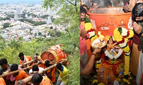 திருவண்ணாமலை அருணாசலேஸ்வரர் கோயிலில் கார்த்திகை தீப திருவிழா, கொடியேற்றத்துடன், துவங்கி நடைபெற்று வருகிறது. தொடர்ந்து, 10 நாட்கள் நடக்கும் விழாவில் தினமும் காலை, மாலை சுவாமி பல்வேறு வாகனத்தில் உலா வந்து அருள்பாலித்து வருகிறார். மகா தீபம் நாளை மாலை 6 மணிக்கு கோவிலுக்கு பின்புறம் உள்ள அண்ணாமலை உச்சியில் ஏற்றப்படுகிறது. அதையொட்டி, சிறப்பு பூஜை செய்யப்பட்டு மகா தீப கொப்பரையை தோளில் சுமந்தபடி பக்தர்கள் மலைக்கு கொண்டு சென்றனர். டிச., 3 அதிகாலை, 4:00 மணிக்கு கோயில் கருவறை எதிரில் பரணி தீபமும், மாலை, 6:00 மணிக்கு, 2668, அடி உயர அண்ணாமலையார் மலை உச்சியில் மஹா தீபமும் ஏற்றப்பட உள்ளது.