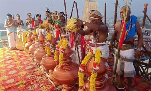 காஞ்சிபுரம்: காஞ்சிபுரம் ஏகாம்பர நாதர் கோவில் கும்பாபிஷேகம் 19 ஆண்டுகளுக்குப் பின் நேற்று கோலாகலமாக நடந்தது. பனி பொழிவிலும், 2 லட்சம் பக்தர்கள் பக்தி பரவசத்துடன் கும்பாபிஷேக விழாவில் பங்கேற்றனர். காஞ்சிபுரம் ஏகாம்பரநாதர் கோவிலில், 2006ம் ஆண்டு கும்பாபிஷேகம் நடந்தது. கும்பாபிஷேகம் முடிந்து, 19 ஆண்டுகள் கடந்த நிலையில், அரசு நிதி, ஆணையர் பொதுநல நிதி, திருக்கோவில் நிதி, உபயதாரர் நிதி என, மொத்தம் 29 கோடி ரூபாய் செலவில் திருப்பணி நடந்து முடிந்த நிலையில், டிச.,8ல் கும்பாபிஷேகம் நடத்தப்படும் என, ஹிந்து சமய அறநிலையத்துறை அறிவித்தது. அதன்படி, கோலாகலமாக நேற்று காலை 6:10 மணிக்கு கோவிலில் கும்பாபிஷேகம் நடந்தது. இதைத் தொடர்ந்து, பிற்பகல் 12:00 மணிக்கு மஹா அபிஷேகமும், மாலை 8:00 மணிக்கு திருக்கல்யாண உத்சவமும், பஞ்சமூர்த்திகள் வீதியுலாவும் நடந்தது. கும்பாபிஷேக பாதுகாப்பு பணியில், மாவட்ட எஸ்.பி.,சண்முகம் தலைமையில், 12 டி.எஸ்.பி.,க்களும், 25 காவல் ஆய்வாளர்கள் மற்றும் 850 போலீசார் ஈடுபட்டனர். காஞ்சிபுரம் நகர்ப்பகுதி மட்டுமல்லாமல், வெளியூர், வெளி மாநிலங்களில் இருந்து, 2 லட்சத்துக்கும் மேற்பட்ட பக்தர்கள் பங்கேற்று, சுவாமியை வழிபட்டனர். பக்தர்களின் பாதுகாப்புக்காக 108 ஆம்புலன்ஸ், தீயணைப்பு வாகனம் தயார் நிலையில் இருந்தது. நடமாடும் மருத்துவமனை வாகனத்தில் மருத்துவர்கள், மருந்து மாத்திரைகளுடன் தயார் நிலையில் இருந்தனர். வணிக நிறுவனங்கள், தன்னார்வ அமைப்புகள், சங்கங்கள் சார்பில், பக்தர்களுக்கு பல்வேறு இடங்களில் அன்னதானம் வழங்கப்பட்டது. பக்தர்களின் வசதிக்காக கோவில் வளாகத்திலும், சுற்றியுள்ள பகுதிகளிலும், மொபைல் டாய்லெட் வசதி ஏற்படுத்தப்பட்டு இருந்தன. கோவில் நிர்வாகம் சார்பில், பக்தர்களுக்காக, 50,000 வாட்டர் பாட்டில், பிஸ்கெட் பாக்கெட் வழங்கப்பட்டன. கும்பாபிஷேகத்திற்கான ஏற்பாட்டை கோவில் அறங்காவலர் வேல்மோகன், செயல் அலுவலர் முத்துலட்சுமி, குருக்கள், ஊழியர்கள், ஸ்தானீகர்கள் உள்ளிட்டோர் இணைந்து செய்திருந்தனர். காஞ்சி மடாதிபதி விஜயேந்திர சரஸ்வதி சுவாமிகள், ஏகாம்பரநாதர் கோவில் கும்பாபிஷேகத்தை முன்னிட்டு நேற்று கூறியதாவது: பஞ்சபூத ஸ்தலங்களில் முதன்மையான மண் ஸ்தலமான பிருத்வி ஷேத்ரமான சிவகாஞ்சி காமாட்சி அம்மன் சமேத ஏகாம்பரநாதர் கோவிலில் இன்றைய தினம் மிக விமரிசையாக சாஸ்திரியமான முறையில் ஜீர்னோதாரன மகா கும்பாபிஷேக விழா நடைபெற்றது. இந்த கும்பாபிஷேகத்தில் முக்கியமான நிகழ்வாக ஜயேந்திர சரஸ்வதி சுவாமிகள் விருப்பப்பட்ட தங்கரதம், ஏகாம்பரநாதருக்கு சமர்ப்பிக்கப் பட்டது. இவ்வாறு அவர் கூறினார்.
