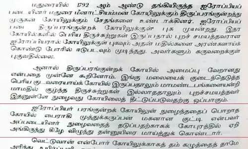 ஆனால் கோயிலின் துாய்மையை காக்க ஒருவர் இவ்வாறு கோபுரத்திலிருந்து குதித்து உயிரை மாய்த்தது புதிய செய்தி. குட்டியின் எதிர்பாராத இச்செயலைக் கண்ட ஐரோப்பிய படையினர், கோயிலினுள் நுழைவதை கைவிட்டு அங்கிருந்து சென்று விட்டனர். இவ்வாறு கோயிலின் துாய்மை காக்க உயிரிழந்த குட்டியை கோயில் அலுவலர்கள் பாராட்டி அவரது குடும்பத்திற்கு ரத்தக் காணிக்கை என்னும் பெயரில் நிலம் அளித்தனர். இவ்வாறு அந்த நுாலில் தெரிவிக்கப்பட்டுள்ளது. – நமது சிறப்பு நிருபர் –