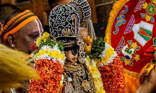 திருச்சி; ஸ்ரீரங்கம் வைகுண்ட ஏகாதசி விழா பகல் பத்து ஏழாம் நாளான இன்று நம்பெருமாள் ஆண்டாள் (கிருஷ்ணன்) முத்துக் கொண்டை சாற்றி, அதில் சிறிய நெற்றி சுட்டித் தொங்கல் அணிந்து பக்தர்களுக்கு காட்சியாளி்ததார். பக்தர்கள் பரவசத்துடன் தரிசனம் செய்தனர்.