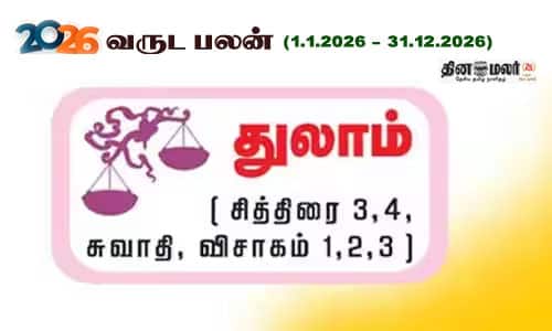 சித்திரை: நல்ல நேரம் வந்தாச்சு தைரிய வீரிய காரகனான செவ்வாயின் நட்சத்திரத்தில் நீங்கள் பிறந்தாலும், 1,2 ம் பாதங்களான கன்னியில் பிறந்தவர்களுக்கு புதன் ராசிநாதனாகவும், 3,4 ம் பாதங்களான துலாத்தில் பிறந்தவர்களுக்கு சுக்கிரன் ராசிநாதனாகவும் உள்ளனர். பிறக்கும் 2026 ஆண்டு, 1,2 ம் பாதத்தில் பிறந்தவர்களுக்கு யோகமாக இருக்கும். செல்வமும் செல்வாக்கும் அதிகரிக்கும். நல்ல காலம் பிறக்காதா என காத்திருந்தவர்களுக்கு நினைத்தது நடந்தேறும். முயற்சிகள் வெற்றியாகும். வாழ்க்கை வளமாகும். தொழில், வியாபாரம் முன்னேற்றம் அடையும். 3,4 ம் பாதத்தினருக்கு பாக்ய குரு, லாப கேது, சத்ரு ஜெய ஸ்தான சனி என நன்மையை வாரி வழங்குவர். கடந்த ஆண்டில் ஏற்பட்ட நெருக்கடி விலகும். போராட்ட நிலை மாறும். பொன்னும் பொருளும் சேரும். புகழும் பெருமையும் உண்டாகும். சித்திரை 1,2 ம் பாதங்களில் பிறந்தவருக்கு ஆண்டின் தொடக்கத்தில் சத்ரு ஜெய சனியால் செல்வாக்கு உயரும். அனைத்திலும் முன்னேற்றம் உண்டாகும். துணிச்சலுடன் செயல்படுவீர்கள். உடல் நிலை சீராகும். வழக்கில் வெற்றி கிடைக்கும். மார்ச் 6 முதல் கண்டச்சனியாக சஞ்சரித்தாலும், அஸ்தமனம், வக்கிரம், குருப்பார்வை என்பனவற்றால் சனியின் பாதிப்பு உங்களை நெருங்காது. 3,4 ம் பாதத்தில் பிறந்தவர்களுக்கு மார்ச் 6 வரை பஞ்சம ஸ்தான சனியால் குடும்பத்தில் நெருக்கடி, உறவுடன் பகை, தம்பதி இடையே கருத்து வேறுபாடு, பிள்ளைகளால் சங்கடம் ஏற்படும். அதன்பின் வருமானத்திற்கு வழியமைப்பார். வியாபாரம், தொழிலில் முன்னேற்றத்தை உண்டாக்குவார். நவ.12 வரை ராகு கும்பத்திலும், கேது சிம்மத்திலும், நவ.13 முதல் ராகு மகரத்திலும், கேது கடகத்திலும் சஞ்சரிப்பதால் 1,2 ம் பாதத்தினருக்கு நவ.12 வரை ராகுவால் வெற்றி சேரும். நினைத்தது நிறைவேறும். நோய், வழக்கு பாதிப்பு இருக்காது. நவ. 13 முதல் லாப கேதுவால் வருமானம் உயரும். செல்வாக்கு கூடும். முடங்கிய தொழில் முன்னேற்றம் பெறும். 3,4 ம் பாதத்தில் பிறந்தவர்கள் நவ. 12 வரை பணப்புழக்கம் காண்பர். நெருக்கடி வந்தாலும் அதை சமாளிக்கும் சக்தி உண்டாகும். நவ. 13 முதல் 4ம் இட ராகுவும், 10ம் இட கேதுவும் உழைப்பை அதிகரிப்பர். வேலை, தொழிலில் போராட்டமான நிலை உண்டாகும். 1,2 ம் பாதத்தில் பிறந்தவர்கள் ஆண்டின் முற்பகுதியில் கவனமாக செயல்படுவது அவசியம். வேலை, தொழிலில் நெருக்கடி உண்டாகும். மே 26 முதல் பணவரவு அதிகரிக்கும். தடைபட்ட வேலை நடந்தேறும். படிப்பு, வேலை, திருமணம், குழந்தை பாக்கியம், வீடு, வாகனம் என்ற கனவு நனவாகும். அக்.20 முதல் ஒரு பக்கம் செலவும், மறுபக்கம் சந்தோஷமும் இருக்கும். 3, 4 ம் பாதங்களில் பிறந்தவர்களுக்கு ஆண்டின் முற்பகுதி யோகமாக இருக்கும். செல்வம், செல்வாக்கு, அந்