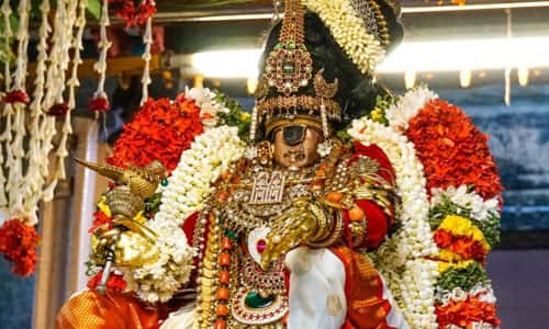 திருச்சி: ஸ்ரீரங்கம் ரங்கநாதர் கோவிலில் வைகுண்ட ஏகாதசி பெருவிழா சிறப்பாக நடைபெற்று வருகிறது. விழாவின் பத்தாம் நாளான இன்று உற்சவர் நம்பெருமாள் நாச்சியார் திருக்கோலம் எனப்படும் மோகினி அலங்காரத்தில் அருள்பாலித்தார். விழாவில் இரத்தினகிளி மாலையுடன் தலையில் நாகாபரணம் பவளமாலை அடுக்குப் பதக்கம் ஏலக்காய் ஜடை தரித்து மூலஸ்தானத்திலிருந்து தங்கப் பல்லக்கில் புறப்பட்டு வெண் பட்டாடை ஒய்யார சாய்வு சவுரிக் கொண்டை கஸ்தூரி திலகம் வலது கரத்திலே இரத்தினங்கள் பதித்த தங்கக் கிளி மார்பிலே திருமாங்கல்யம் முத்து பவள மணிமாலைகள். காலிலே தங்க தண்டைக் கொலுசுக் காப்புகள் உள்ளிட்ட திருவாபரணங்கள் அணிந்து பெண் வேடமிட்டு "நாச்சியார் திருக்கோலம்" எனப்படும் மோகினி அலங்காரத்தில் அர்ச்சுன மண்டபத்தில் எழுந்தருளி அரையர்கள் இசைத்த தீந்தமிழ் திவ்விய பிரபந்தத்தின் திருமொழி பாசுரங்களை கேட்டவாறு பக்தர்களுக்கு சேவை சாதித்தார். ஏராளமான பக்தர்கள் தரிசனம் செய்தனர்.