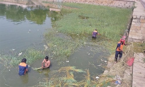 தினமலர் செய்தி எதிரொலி; திருப்பரங்குன்றம் தெப்பக்குளத்தில் தூய்மை பணி