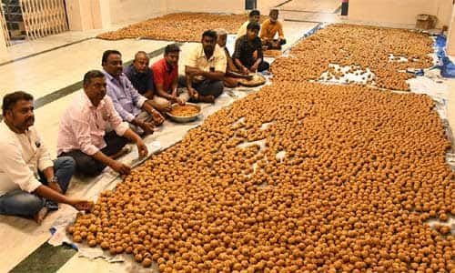 வைகுண்ட ஏகாதசியை யொட்டி, விழுப்புரம் வைகுண்டவாச பெருமாள் கோவிலில் வரும் இன்று அதிகாலை 5:00 மணிக்கு சொர்க்கவாசல் திறக்கப்படுகிறது. இங்கு, சுவாமியை தரிசனம் செய்ய வரும் பக்தர்களுக்கு கோவில் நிர்வாகிகள் மூலம் பிரசாதமாக லட்டு வழங்குவது வழக்கம். இதையொட்டி, பக்தர்களுக்கு பிரசாதமாக வழங்க 1 லட்சத்து 8 ஆயிரம் லட்டுகள் தயாரிக்கும் பணிகள் சி.ஆர்., ஜோதி லட்டு கமிட்டி சார்பில் 36வது ஆண்டாக விழுப்புரத்தில் நடந்தது. லட்டு தயாரிப்பு பணிகளில் லட்டு கமிட்டி உறுப்பினர்கள் ஜீவா, ராஜா, வீரமணி, கருணா, சங்கர், கோவிந்தன், செல்வம், அரிகரசுதன் ஆகியோர் ஈடுபட்டனர்.