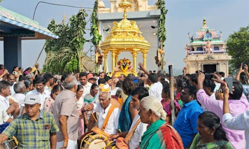 பல்லடத்தை அடுத்த, செஞ்சேரிமலையில், மந்திரகிரி வேலாயுத சுவாமி கோவில் உள்ளது. பிரசித்தி பெற்ற இக்கோவிலுக்கு, பக்தர்கள் பங்களிப்புடன் தங்கத்தேர் உருவாக்கப்பட்டு, சமீபத்தில் அர்ப்பணிக்கப்பட்டது. நேற்று முன்தினம், அடிவாரத்தில் இருந்த தங்கத்தேர், மலை மேல் அமைந்துள்ள கோவிலுக்கு எடுத்துச் செல்லப்பட்டது. இதனையடுத்து, தங்கத்தேர் கிரிவல விழா இன்று நடந்தது. செஞ்சேரிமலை ஆதீனம் முத்துசிவராமசாமி அடிகளார் விழாவை துவக்கி வைத்தார். முன்னதாக, காலை, 6.30 மணிக்கு மங்கள இசை, பூர்வாங்கம் மற்றும் ஓம பூஜைகள் நடந்தன. தொடர்ந்து, ரத பிரதிஷ்ட்டை நடந்தது. பூஜிக்கப்பட்ட கலச தீர்த்தங்களால், ரத்ததுக்கு கும்பாபிஷேகம் நடந்தது. தொடர்ந்து, வள்ளி தெய்வானை சமேதராக மந்திரகிரி வேலாயுத சுவாமி தங்க ரதத்தில் எழுந்தருளினார். அரோகரா கோஷம் முழங்க பக்தர்கள் வடம் பிடிக்க, கிரிவலப் பாதை வழியாக ரதம் கோவிலை வந்தடைந்தது. சிறப்பு அலங்காரத்தில் மூலவர் முருகப்பெருமான் பக்தர்களுக்கு அருள்பாலித்தார். பங்கேற்ற பக்தர்கள் அனைவருக்கும் அன்னதானம் வழங்கப்பட்டது.