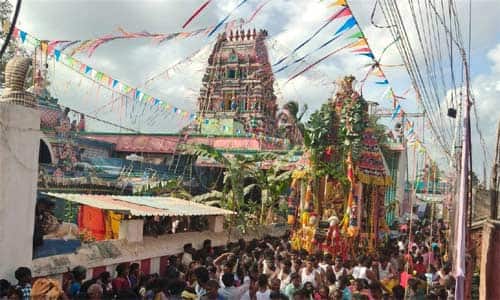 நேற்று பிற்பகல் 3:00 மணிக்கு தங்கக் கவசத்தில் அம்மன் திருத்தேர் புறப்பட்டது. திரளான பக்தர்கள் தேரை வடம் பிடித்து இழுத்துச் சென்றனர்.