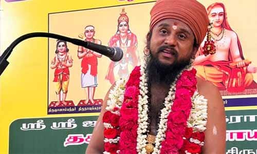 ரிக் வேதத்தில் இரண்டு ஸ்வரங்களாக வரும், இதை தமிழில் புகுத்தியவர் திருஞானசம்பந்தர். மூவர் தேவாரம் முழுவதும் பாடினால், ஐந்து ஆண்டுகளாகும். ஒருவன் தன் குருநாதரை மறந்து விட்டால், என்ன செய்தாலும் அவன் வாழ்வில் ஒரு பயனும் கிடைக்காது. குருவை வணங்கினால் மட்டுமே புண்ணியம் கிடைக்கும் இவ்வாறு பேசினார்.