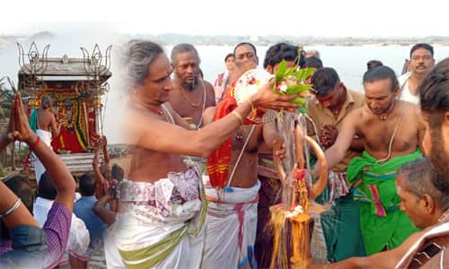 மயிலாடுதுறை; பூம்புகார் காவிரி சங்கமத்தில் தீர்த்தவாரி நடைபெற்றது.. சந்திரசேகரர், திவ்ய தேச பெருமாள்கள் எழுந்தருள திரளான பக்தர்கள் தரிசனம் செய்தனர்.
