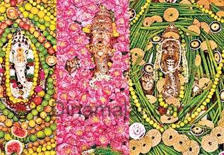 தாமரை, செவ்வந்தி, டேலியா, ரோஜா என பூக்கள் மட்டுமல்ல மா, கொய்யா, அன்னாசி, வாழை, ஆப்பிள், சாத்துக்குடி, எலுமிச்சை என பழவகைகள் மட்டுமா, தேங்காய், சுரைகாய், கத்தரிகாய், முருங்கைகாய், கரும்பு, வெற்றிலை, அருகம்புல் மற்றும் முறுக்கு, லட்டு, அதிரசம் போன்ற பலகாரங்களுடன், கரன்சி நோட்டுகள் ,ஐந்து ரூபாய் நாணயம் என பல வித விதமாய் அலங்காரங்கள் சிறப்பாக செய்யப்படுகிறது. குறிப்பாக இந்த அலங்காரங்களை வருடப்பிறப்பு, தை, ஆடி மாத நான்கு வெள்ளி க்கிழமைகள், வைகுண்ட ஏகாதசி, திருவாதிரை, மதுரை மீனாட்சி திருக்கல்யாண நாள், விநாயகர் சதுர்த்தி, பண்டிகை நாட்களில் செய்கின்றனர்.பெத்தாட்ஷி விநாயகர் கோயில் தலைமை அர்ச்சகர் ராமச்சந்திரன் கூறுகையில், ""ஆயிரத்து எட்டு என்ற எண்ணிக்கையில் அலங்காரங்கள் செய்வது தனிச்சிறப்பு. பல ஆண்டுகளாக செய்து வருகிறோம். அலங்காரம் செய்ய குறைந்தது இரண்டு மணி நேரமாவது ஆகும்,என்றார்.