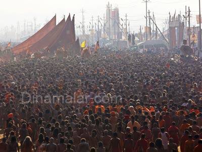 உ.பி., மாநிலம் அலகாபாத்தில், தை அமாவாசை புனித நீராடலில், 3 கோடி மக்கள் பங்கேற்றனர். அதிகாலையில், ஆயிரக்கணக்கான நாகா சாதுக்கள், கங்கையில் நீராடி அணிவகுப்பாக நடந்து சென்ற காட்சி, மக்களை பரவசத்தில் ஆழ்த்தியது.உ.பி., மாநிலம் அலகாபாத், பிரயாகையில் கடந்த, ஜன., 14ம் தேதி துவங்கிய கும்பமேளா, வரும் மார்ச், 10ம் தேதி வரை நடக்கிறது.கும்பமேளாவின் உச்சக்கட்டமான, தை அமாவாசை நீராடல், நேற்று, கோலாகலமாக கொண்டாடப்பட்டது.