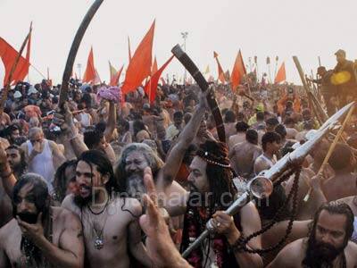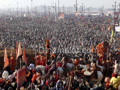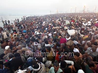 கரையை காணவில்லை:நாட்டின் பல பகுதிகளில் இருந்தும் குவிந்த, 3 கோடி பேர், இந்த நீராடலில் நேற்று பங்கேற்றனர். நேற்று மட்டும், 2 கோடி பேர், அலகாபாத்திற்கு வந்தனர். அரசியல் லாபம் அல்லது அதிகாரம் இன்றி, எல்லாத்தரப்பு மக்களும் பங்கேற்றனர். யாத்ரீகர்கள் கூட்டத்தில், கங்கை கரையே காணாமல் போனது போன்ற, தோற்றம் ஏற்பட்டது. கடும் குளிருக்கும், கொட்டும் பனிக்கும் அசராத மக்கள், தங்கள் குடும்பங்களுடன், கங்கை கரையில், ஆங்காங்கே வெட்ட வெளியில் தங்கினர்.நேற்று அதிகாலை, 5:15 மணிக்கு, துறவிகளின் நீராடல் துவங்கும் என, மாநில அரசு அறிவித்திருந்தது. எனினும், நேற்று அதிகாலை, 3:00 மணி முதலே, மக்கள் கங்கையில் நீராட துவங்கினர்.சரியாக, 5:30 மணிக்கு, மகாநிர்வாணி அகாடாவை சேர்ந்த, நாகா சாதுக்கள், ஊர்வலமாக கங்கை கரைக்கு வந்தனர்.