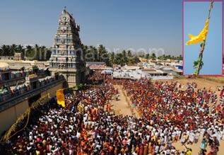 அமைச்சர்களுக்காக காத்திருந்த கொடிமரம்: காலை 10.30 மணிக்கு கொடியேற்ற நிகழ்ச்சி நடப்பதாக அறிவிக்கப்பட்டது. இதற்காக 10.10 மணிக்கு துணை சபாநாயகர் ஜெயராமன், மேயர் வேலுச்சாமி ஆகியோர் வந்தனர். அதேசமயத்தில் கொடிமரமும் கோவில் வளாகத்தினுள் வந்தது. கொடி மரம் நிலைநிறுத்த தயார் நிலையில் வைக்கப்பட்டிருந்தது.ஆனால் அமைச்சர் ஆனந்தனும்; தாமோதரனும் வர தாமதமானதால் கோவில் நிர்வாகத்தினரும், பக்தர்களும் வெயிலில் காத்திருந்தனர். காலை 11.00 மணிக்கு இரு அமைச்சர்களும் வந்த பிறகு 11.05 மணிக்கு கொடி மரம் நிலைநிறுத்தப்பட்டது. கூட்டத்தில் இருந்த பக்தர்கள், "தெய்வத்திற்காக மனிதன் காத்திருந்த நிலை மாறி அமைச்சர்களுக்காக தெய்வம் காத்திருக்க வேண்டியுள்ளது என்று கூறினர்.