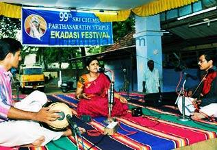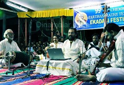 பாலக்காடு: செம்பை பார்த்தசாரதி கோவில் ஏகாதசி திருவிழாவின் இரண்டாம் நாளான நேற்று, முன்னணி கலைஞர்களின் இசை நிகழ்ச்சி விமர்சையாக நடைபெற்றது. கேரள மாநிலம் பாலக்காடு அருகே உள்ள கோட்டாயி பார்த்தசாரதி கோவில் ஏகாதசி திருவிழா, நேற்றுமுன்தினம் கொடியேற்றத்துடன் துவங்கியது; வரும் 22ம் தேதி வரை, இவ்விழா நடைபெறுகிறது. விழாவின் முதல்நாளில், கொடியேற்றத்தை தொடர்ந்து, சுவாமிக்கு சிறப்பு பூஜைகள் நடைபெற்றன. முதல் நாள் இரவு பிரபல பாடகர், பத்மபூஷண் யேசுதாசின் சங்கீத கச்சேரி நடைபெற்றது. இரண்டாம் நாளான நேற்று, காலை, 9:00 மணிக்கு, உஞ்சவிருத்தி பஜனை நடந்தது. தொடர்ந்து, முன்னணி கலைஞர்கள் பங்கேற்ற, பஞ்சரத்ன கீர்த்தனை இசைக்கப்பட்டது. நேற்று காலை, 11:00 மணிக்கு, ராமநாதனின் (பிரகாஷ்) சாக்சபோன் இசை கச்சேரியும், 12:00 மணிக்கு, செம்பை வித்யாபீடம் மாணவர்களின் சங்கீத ஆராதனையும் நடந்தது. நேற்று மாலை, 5:30 மணியளவில், புவனா ராமசுப்புவின் வாய்ப்பாட்டு நிகழ்ச்சி நடந்தது. ஹம்ஸத்வனி ராகத்தில், "விநாயகா நினுவினா ப்ரோசுடகு... என்ற பாடலும், பந்துவராளி ராகத்தில், "அர்த்தனாரீஸ்வரி ஆராதனயாமீம் என்ற பாடலும், மத்யமாவதி ராகத்தில், "தர்ம சம்வர்தனே... தனுஜ சம்வர்தனே... என்ற பாடலும், மோகன ராகத்தில், "கோபிகா மனோகரம் பஜே ஹம் கோவர்தனம் சுரவரம்... என்ற பாடலும், இசை பிரியர்களின் செவிக்கு, விருந்தாக அமைந்தன. நேற்று மாலை, பத்மபூஷண் கோபாலகிருஷ்ணன், விஜய் யேசுதாஸ், பின், கலாரத்னம் ஜெயன் (ஜெயவிஜயா) ஆகியோரின் சங்கீத கச்சேரி நடைபெற்றது. ஒருவார ஏகாதசி உற்சவத்தில், மூலவருக்கு ஸ்ரீபூதபலி, பள்ளிவேட்டை, ஆராட்டு, மஞ்சள் நீராடல், பவனி ஊர்வலம் என, தினமும் சிறப்பு வைபவம் நடைபெற்று வருகிறது. விழாவில் செம்பை கோதண்ட ராம பாகவதர், சென்னை என்.ஆர். பத்மனாபன் (அம்பி), சுகுமாரி நரேந்திர மேனோன் உள்ளிட்ட கலைஞர்களின், இசைக் கச்சேரியும் நடைபெற்றன. கேரளா மற்றும் தமிழகத்தின் பல்வேறு பகுதிகளிலிருந்து பக்தர்கள், முன்னணி இசை கலைஞர்கள், இசை பிரியர்கள், விழாவில் கலந்து கொண்டனர்.