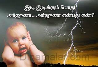 நம் ஊரில் மழை பெய்யும் போது இடி இடித்தால் போதும். அர்ஜுனா...அர்ஜுனா என்பார்கள் பெரியவர்கள். உடனே, நம் வீட்டு இளசுகள், நீ அர்ஜுனான்னு சொன்னவுடனே, அவன் வில்லையும் அம்பையும் எடுத்துகிட்டு வந்து, இடி சத்தமே இல்லாம பண்ணிட போறானாக்கும் என்று கேலி செய்வார்கள். இடிதாங்கி கண்டுபுடிச்சு எத்தனையோ வருஷமாகியும், அதை பில்டிங் மேலே வைக்காம இன்னமும் அர்ஜுனான்னு புலம்பிகிட்டு இருக்கியே! என்று இடியிலிருந்து தப்பும் அறிவியல் உபகரணம் பற்றியும் எடுத்துச் சொல்வார்கள்.உண்மையில், உண்மையான அறிவியல் காரணம் என்ன தெரியுமா?இடி பலமாக இடிக்கும் போது, சிலரது காது அடைத்து ஙொய்ங் என்று சத்தம் வரும். இதிலிருந்து தப்ப அர்ஜுனா என்றால் போதும். காது அடைக்காது. அர் என்று சொல்லும் போது, நாக்கு மடிந்து மேல் தாடையைத் தொடும். ஜு என்னும் போது வாய் குவிந்து காற்று வெளியேறும். னா என்னும் போது, வாய் முழுமையாகத் திறந்து காற்று வெளியே போகும். இப்படி காற்று வெளியேறுவதால் காது அடைக்காது. அதற்குத்தான் அர்ஜுனா வை நம்மவர்கள் துணைக்கு அழைத்தார்கள். அர்ஜுனன் கிருஷ்ண பக்தன் என்பதால், அவன் பெயரை உச்சரிப்பது மனதுக்கு பலம் என்ற ஆன்மிக காரணத்துடன், காது அடைத்து விடக்கூடாது என்ற அறிவியல் காரணமும் இதில் புதைந்து கிடக்கிறது. இனிமேல், இடி இடித்தால் அர்ஜுனா கோஷம், இடியையும் தாண்டி ஒலிக்கட்டும்! சரியா!