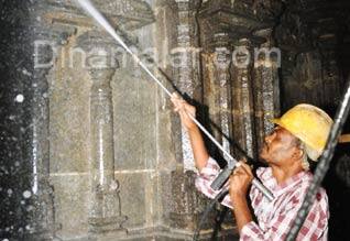 ராமேஸ்வரம்: ராமேஸ்வரம், ராமநாத சுவாமி கோவிலில், அடுத்தாண்டு கும்பாபிஷேகம் நடைபெற உள்ளதால், பழமை மாறாமல் முதல் பிரகார தூண்கள், சிற்பங்களை புதுப்பிக்கும் பணி நடந்து வருகிறது. சுவாமி, பர்வதவர்த்தினி அம்மன் சன்னிதியில், இப்பணி, 50 லட்ச ரூபாயில் நடந்து வருகிறது. ரசாயனம் கலந்த தண்ணீரை தூண்கள், சிற்பங்களில் தடவி, அதை தண்ணீரால் பீய்ச்சி அடித்து தூசி, அழுக்குகள் கற்றப்படுகிறது. இப்பணி முடிந்த பின், தூண்கள், சிற்பங்களில் வார்னிஷ் பூச உள்ளனர். "ஏழு மாதங்கள் வரை, இப்பணி தொடரும் என, இப்பணியில் ஈடுபட்டுள்ள ஒப்பந்த ஊழியர்கள் தெரிவித்தனர்.