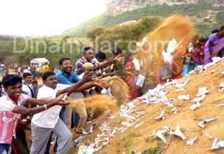மேலூர்: விவசாயம் செழிக்க வேண்டி, ஒவ்வொருவரும் கைப்பிடி மண்ணை எடுத்துப் போட, அந்த மண் மலையாக மாறி வருகிறது. மேலூர் அருகே கார்த்திகை தீப வினோத வழிபாட்டில் இதுவும் ஒன்று. மேலூரில் நரசிங்கம்பட்டியில் உள்ளது பெருமாள் மலை. இங்குள்ள முன்னமலை ஆண்டிச்சாமி கோயிலில், கார்த்திகை தின வழிபாடு நேற்று நடந்தது. அருகிலுள்ள ஓடையிலிருந்து, கைகளால் எடுத்து வரப்பட்ட மணலை பக்தர்கள் ஒரு குறிப்பிட்ட இடத்தில் வீசி வழிபாடு செய்தனர். மணலுடன் உப்பு, மிளகு சேர்த்து வீசினால் விவசாயம் செழிக்கும் என்பது இம்மக்களின் நம்பிக்கை. வீசப்பட்ட கைப்பிடி மண் படிப்படியாக மலையாக மாறி வருகிறது. இரவில் பெருமாள் மலை மீது தீபம் ஏற்றப்பட்டது. மேலவளவு அருகில் உள்ள கருப்புக் கோயிலில், கற்களை வீசி வழிபடுவது வழக்கம். மலை உச்சிமீது ஏறும் பக்தர்கள், அங்கிருந்து கீழ் நோக்கி கற்களை எறிவர். செங்குத்தான இம்மலை மீது சென்று தங்கள் நேர்த்திக்கடனை பக்தர்கள் செலுத்தினர். ஆட்டுக்குளம் பெருமாள் மலையில் நேற்று இரவு, கல் விளக்கில் தீபம் ஏற்றப்பட்டது.