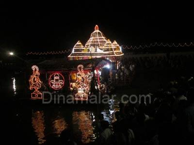 திருவாலங்காடு: வடாரண்யேஸ்வர சுவாமி கோவிலில், நேற்று முன்தினம் இரவு நடந்த தெப்பத் திருவிழாவில், ஆயிரக்கணக்கான பக்தர்கள் கலந்து கொண்டு தரிசனம் செய்தனர். திருத்தணி முருகன் கோவிலின் உபகோவிலான திருவாலங்காடு வடாரண்யேஸ்வரர் சுவாமி கோவிலில், நேற்று முன்தினம் சுவாதி நட்சரத்தில் ஆலங்காட்டீசர் ஆலய சென்றாடு தீர்த்தக் குளத்தில் தெப்பத் திருவிழா நடந்தது. முன்னதாக காலை, 10:00 மணிக்கு மூலவருக்கு சிறப்பு அபிஷேகம், அலங்காரம் மற்றும் தீபாராதனை நடந்தது. மாலை, 7:00 மணிக்கு வண்டார் குழலியம்மை, சமேத வடாரண்யேஸ்வர சுவாமி சென்றாடு தீர்த்தக் குளத்தில் அலங்கரிக்கப்பட்ட தெப்பத்தில் எழுந்தருளினார். பின்னர், அங்கு சிறப்பு பூஜை, தீபாராதனை நடந்தது. தொடர்ந்து, (நேற்று முன்தினம்) இரவு, 7:30 உற்சவ பெருமான் குளத்தை மூன்று முறை வலம் பக்தர்களுக்கு அருள்பாலித்தார். தெப்பலில் வீரமணியின் பக்தி கச்சேரி நடந்தது. தெப்பம் வலம் வரும் போது சில பக்தர்கள், கற்பூரம் ஏற்றி தேங்காய் உடைத்து, வழிப்பட்டனர். விழாவை ஓட்டி கோவில் மற்றும் குளத்தை சுற்றியும் வண்ண விளக்குளால் அலங்கரிக்கப்பட்டிருந்தது. இதில், மாவட்ட ஆட்சியர் வீரராகவராவ், உள்பட பலர் கலந்து கொண்டனர். மாவட்ட எஸ்.பி. சரவணன் தலைமையில், 100க்கும் மேற்பட்ட போலீசார் பாதுகாப்பு பணியில் ஈடுபட்டிருந்தனர். விழாவிற்கான ஏற்பாடுகளை கோவில் தக்கர் ஜெய்சங்கர், இணை ஆணையர் புகழேந்தி மற்றும் ஊழியர்கள் செய்திருந்தனர்.