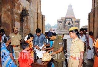 தஞ்சாவூர்: டிசம்பர் 6ம் தேதி பாபர் மசூதி இடிப்பு தினத்தை முன்னிட்டு, தஞ்சாவூர் பெரிய கோவிலில் பலத்த பாதுகாப்பு போடப்பட்டுள்ளது. இதைத் தொடர்ந்து பெரிய கோவில் வரும் சுற்றுலா பயணிகளின் உடமைகள் தீவிரமாக சோதனை செய்யப்பட்டது.